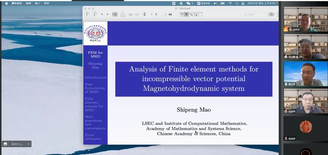在报告会中,毛士鹏研究员汇报了电磁场模型有限元数值模拟方面的一些新进展。毛教授从该团队近期的一个实际电磁工程项目出发,对电磁模型的建立与改进、能量守恒性分析、对磁场和电场分别采用混合有限元和棱单元逼近的全离散格式的建立、有限元逼近的收敛性分析、数值仿真等一整套理论与实践进行了详细的讲述。