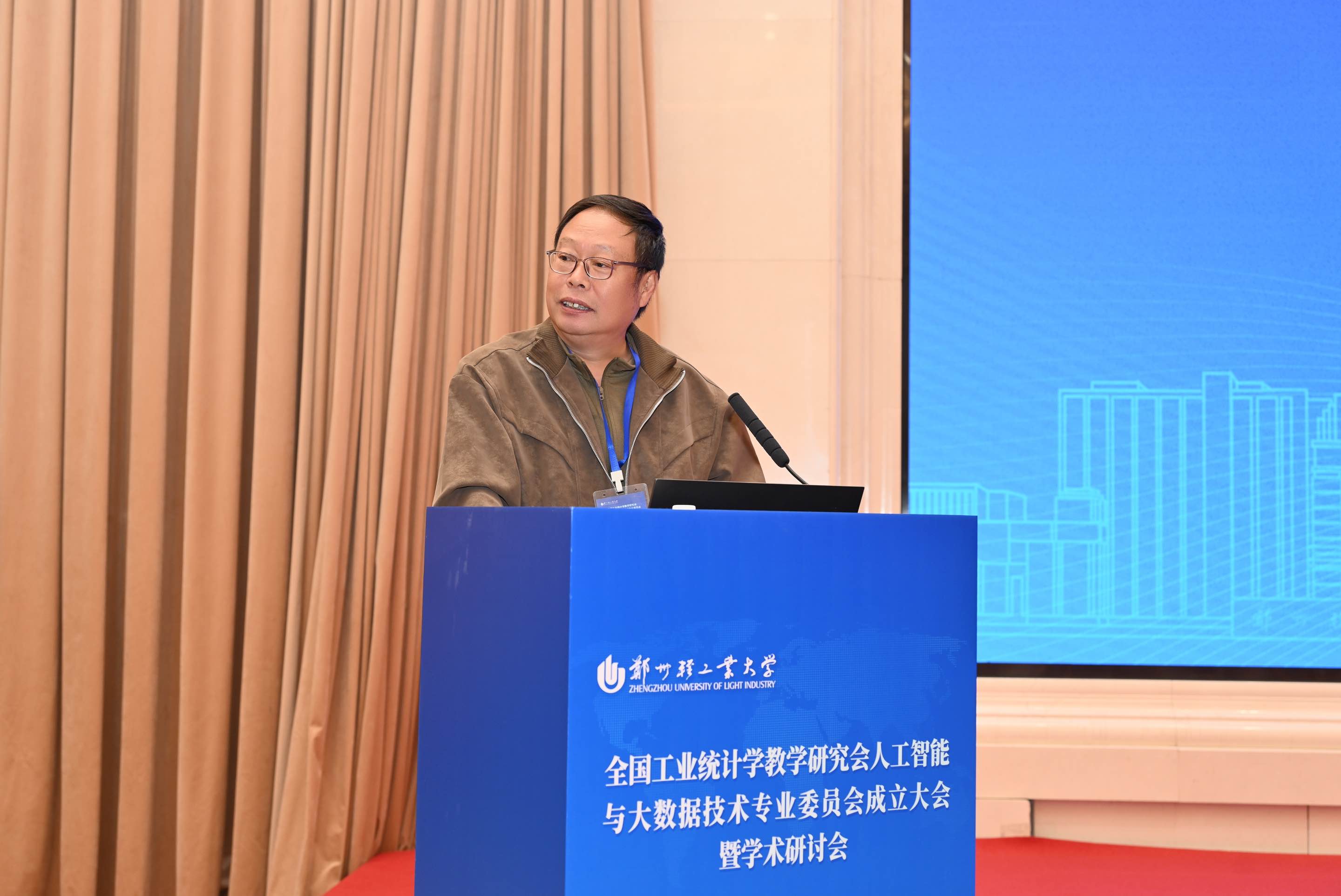 大会执行主席、全国工业统计学教学研究会副会长、全国应用统计专业学位研究生教育指导委员会委员兼案例组组长、首都经济贸易大学张宝学教授代表全国工业统计学教学研究会致辞,对人工智能与大数据技术专业委员会的成立表示祝贺。