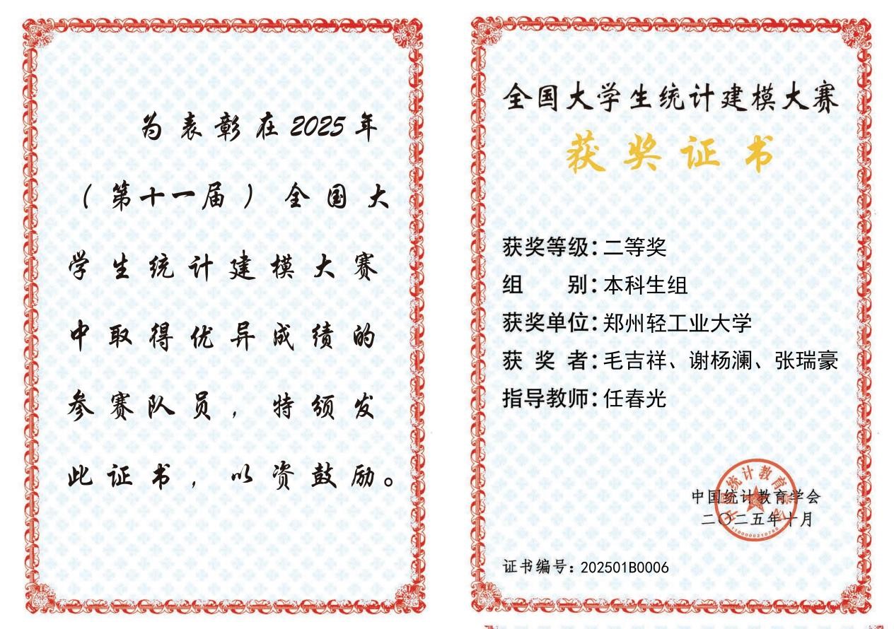 第十一届全国大学生统计建模大赛国家级证书