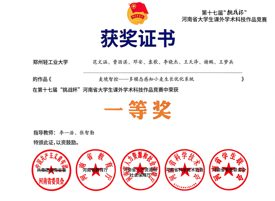 第十七届“挑战杯”河南省大学生课外学术科技作品竞赛证书