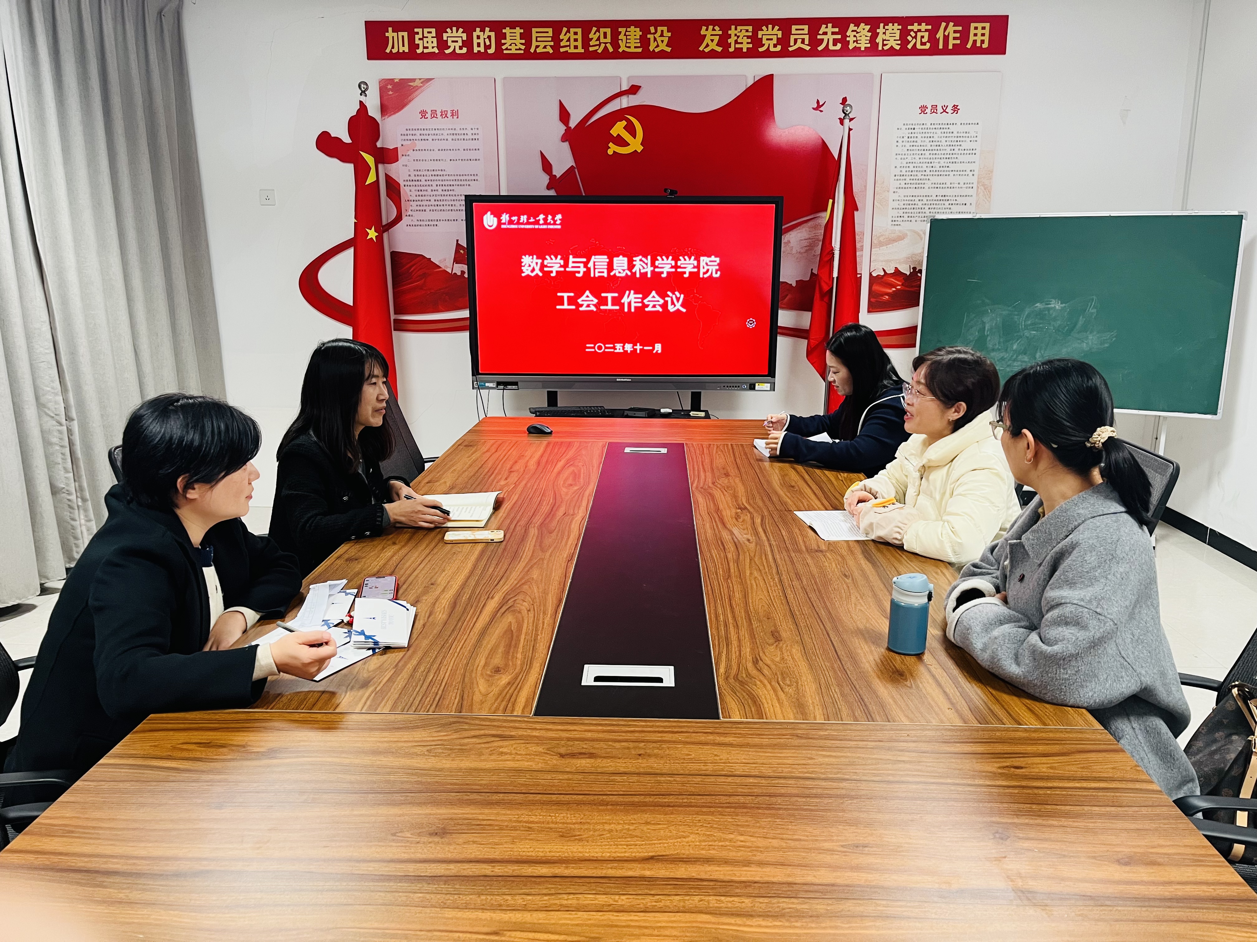 为深入学习贯彻落实党的二十大和二十届四中全会精神,保障工会工作提质增效,数学与信息科学学院于2025年11月6日下午在东一楼205召开学院工会委员会议,全体工会委员参会,会议由学院工会主席矫菲主持。