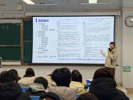 在本次大讲堂上,他结合个人求学与实习经历,为大家拆解从校园到职场的进阶密码。他首先对当下就业市场的趋势与行业分布进行了全面而细致的分析,重点阐述了互联网、自动驾驶、机器人等热门领域的发展前景与岗位需求。通过详实的数据和生动的案例,帮助同学们清晰地了解不同行业的发展动态,从而找准适合自己的职业方向,为未来的职业发展奠定坚实基础。接着聚焦实习、求职与面试的核心准备要点,分享简历制作技巧、面试流程与应对策略、投递时间规划等实用干货,针对考研、考公、就业等多元选择,提供个性化的决策建议与时间规划方案。在互动环节与会同学踊跃提问,姜磊结合自身经历给出建议。